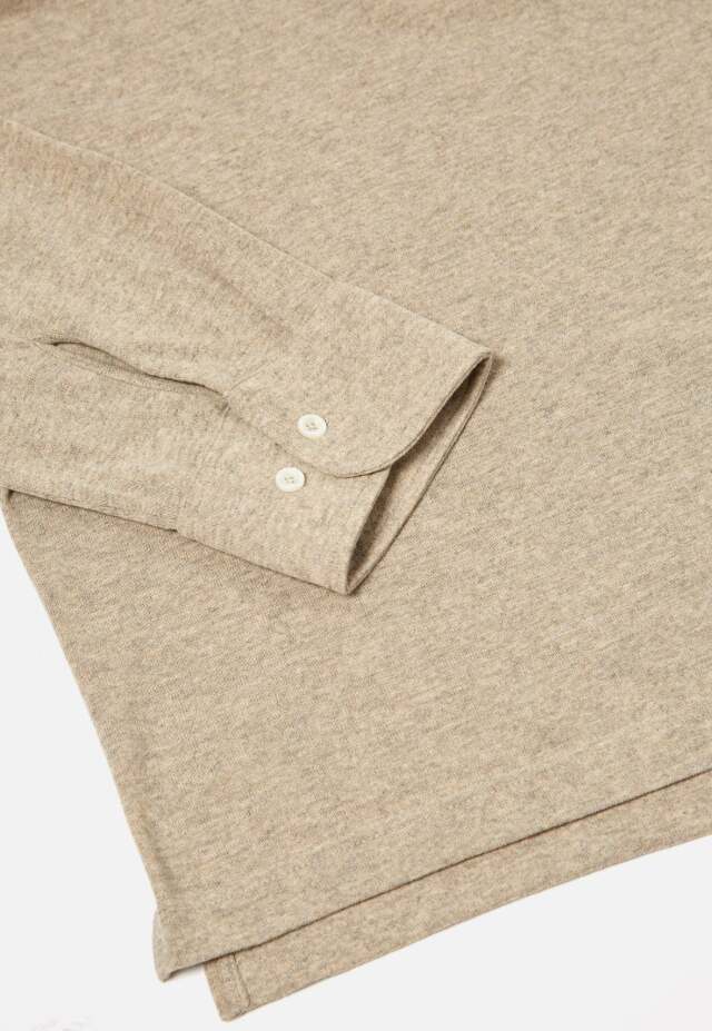 AW23の新しいジャージースタイルである「プルオーバー長袖シャツ」は、頭からかぶるジャージーシャツだが、前立てにボタンが追加されています。着心地がよく、スタイリッシュです。